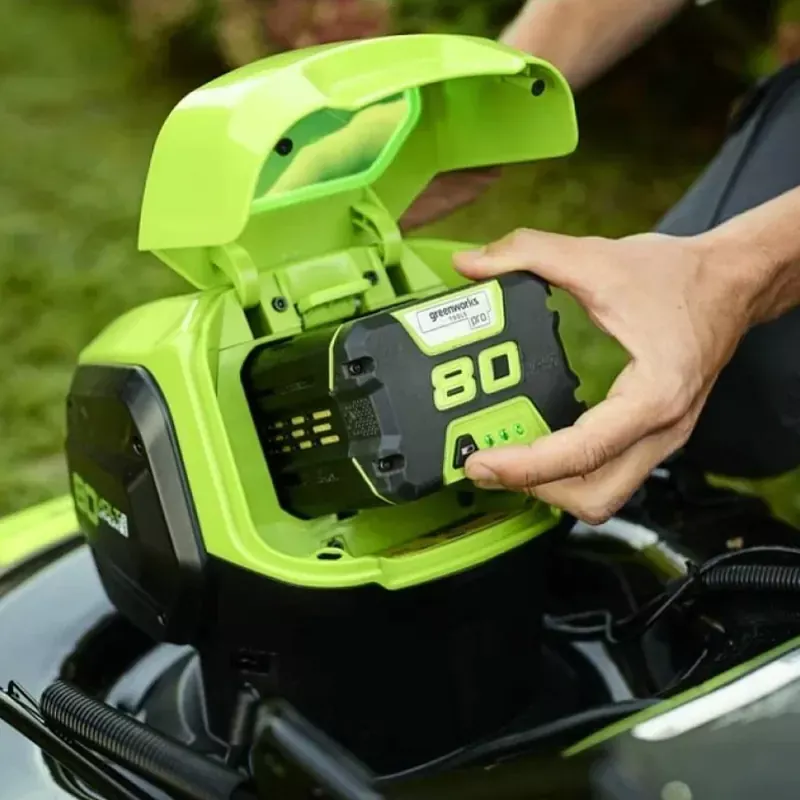 - Газонокосилка работает от аккумуляторной батареи 80V PRO, которую можно использовать другими с устройствами линейки 80V.