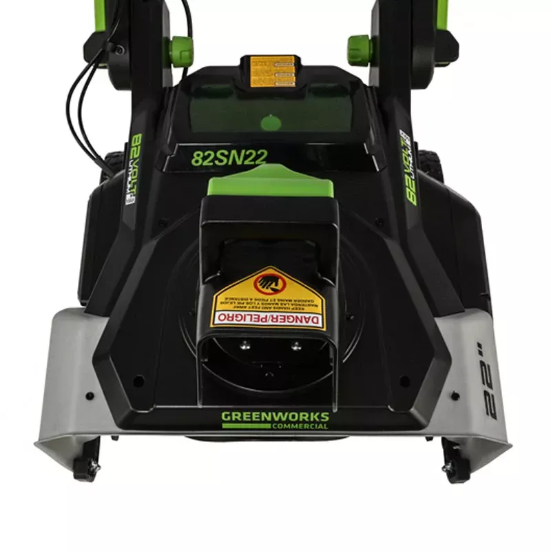 Снегоочиститель GreenWorks GD82 работает от батарей на 82 V, которые имеют длительный срок эксплуатации до 2000 циклов заряда-разряда. Отдельный разъем для хранения накопителя позволяет быстро заменить его на запасной. Это дает возможность использовать инструмент более 1 ч, не отвлекаясь на смену аккумулятора.