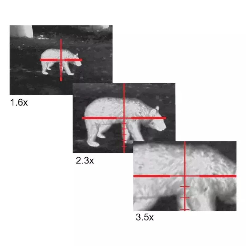 Дальность обнаружения достигает 1000 м (для объектов высотой 1,7...1,8 м), а за счёт малой кратности 1,4x и широкого поля зрения (17,5° или 30,8 м/100 м) обеспечивается отличная обзорность, быстрый поиск и максимально комфортное отслеживание движущихся целей на ближних дистанциях.