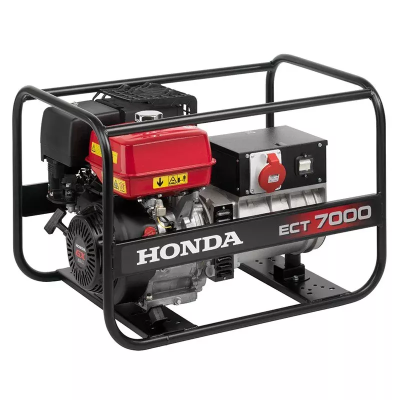 Бензиновый генератор Honda ECT 7000 производит как однофазный, так и трехфазный ток. При напряжении 230 В максимальная мощность электростанции – 4 кВт, а при 400 В – 7 кВт. Мотор заводится с помощью ручного стартера, декомпрессионный механизм облегчает запуск установки.