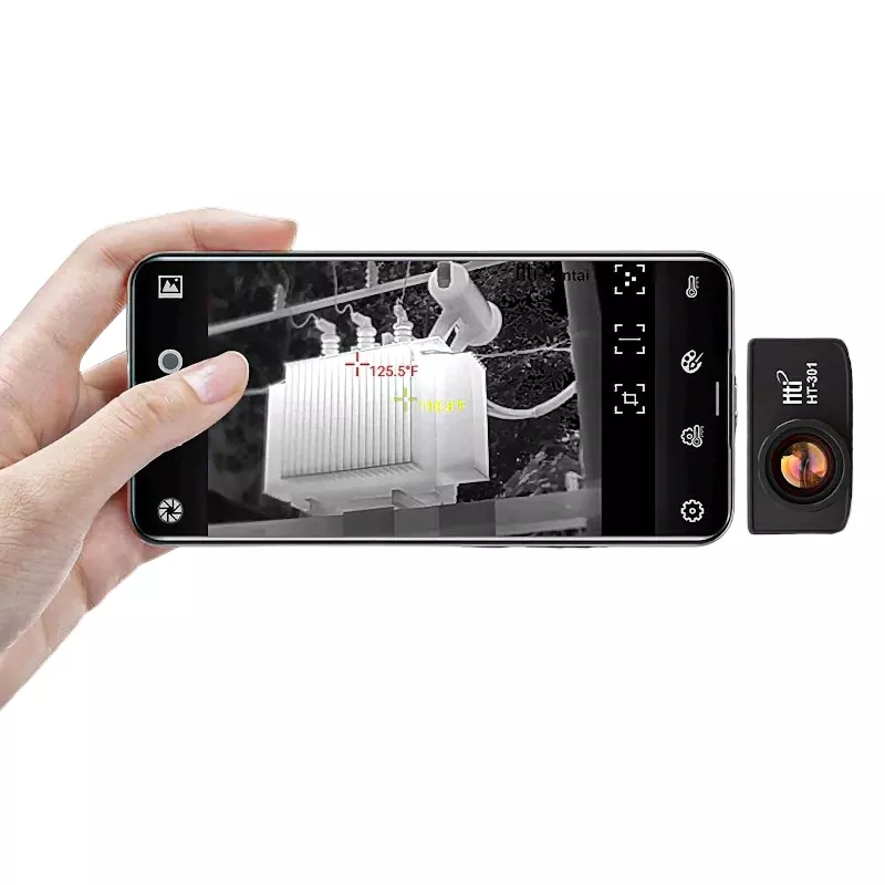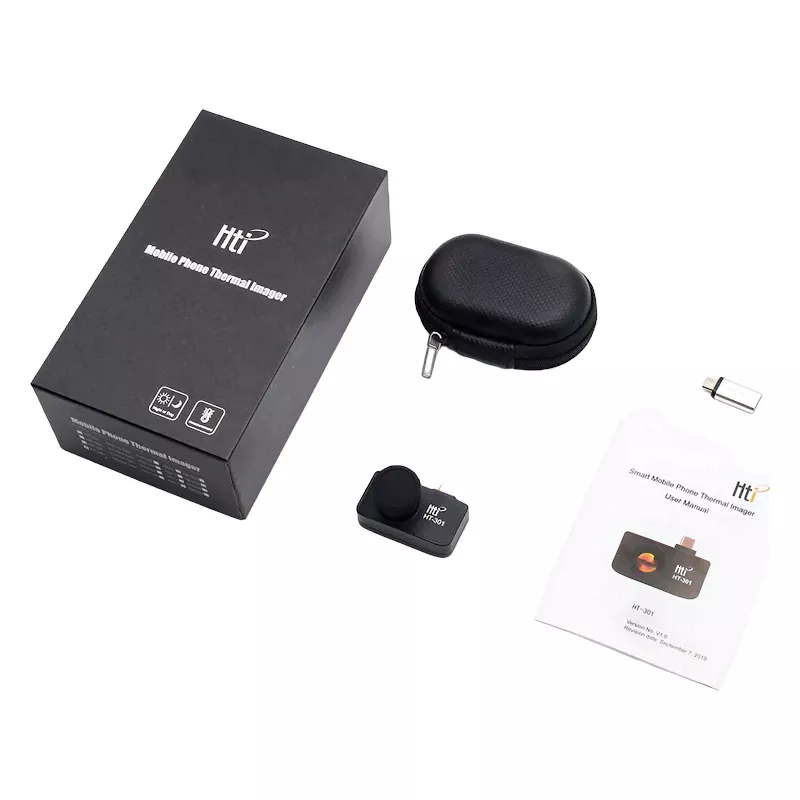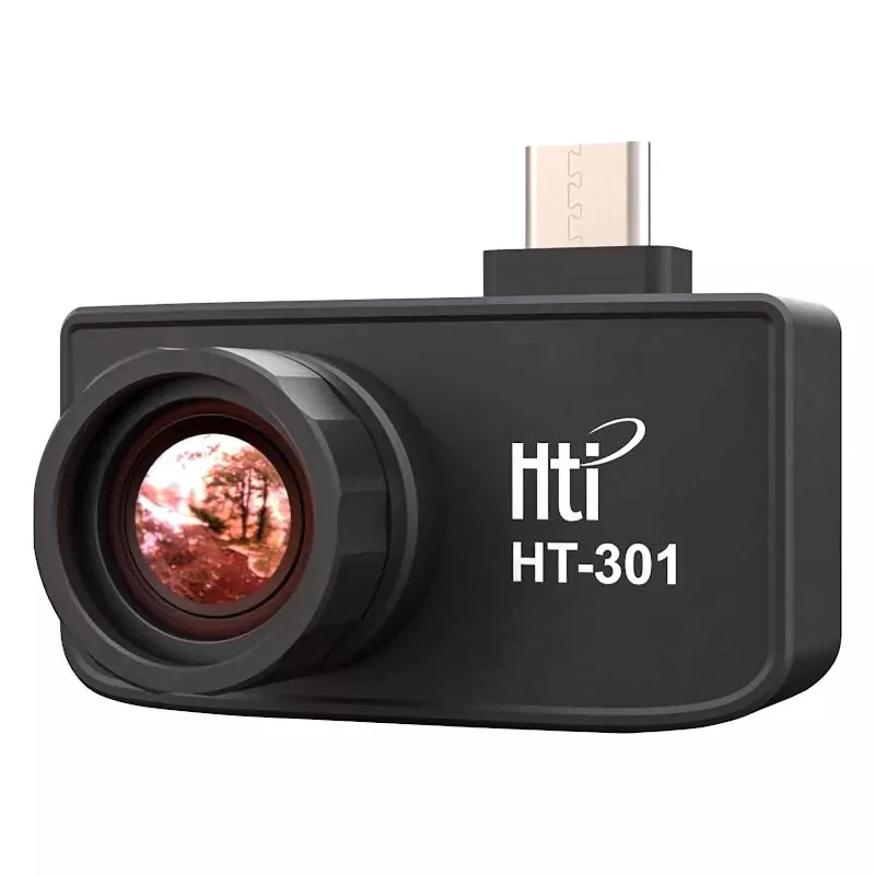 Тепловизор для смартфона Hti HT-301 подключается через USB адаптер к смартфону, поэтому удобен в использовании. Модель обладает разрешением матрицы 384 х 288 и объективом на 13 мм. Диапазон измерений температуры составляет от - 20 до + 400 °C.