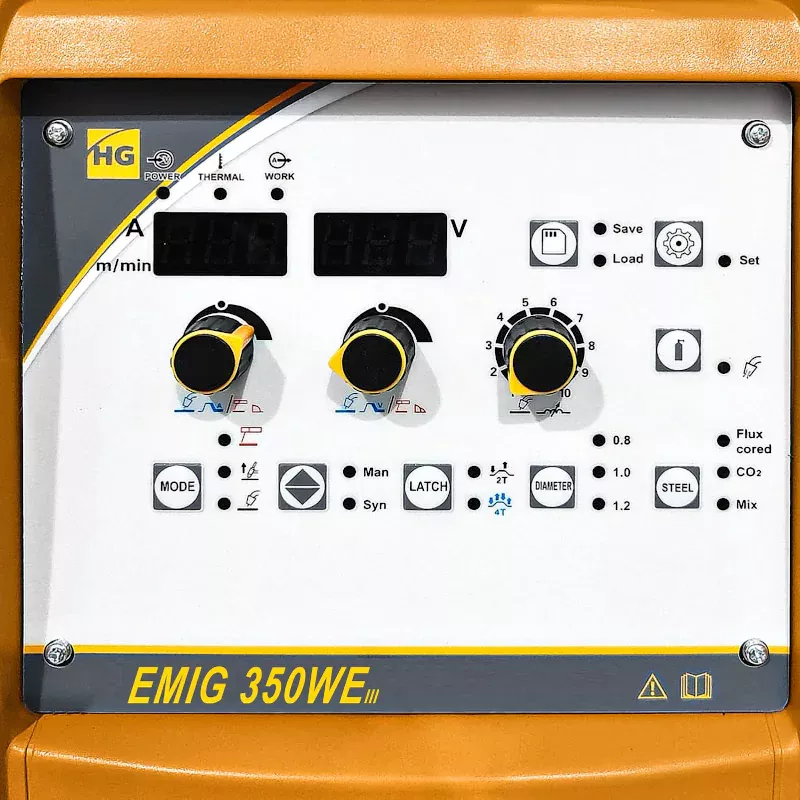 Вы можете вручную настраивать напряжение, силу тока, скорость подачи проволоки от 1 до 20 м/мин. Горелка сварочного аппарата Hugong EMIG 350WE III работает в двух режимах: 2Т для формирования коротких швов и 4Т — длинных. В режиме синергетического управления все основные настройки задаются автоматически, что экономит время на подготовку к работе.