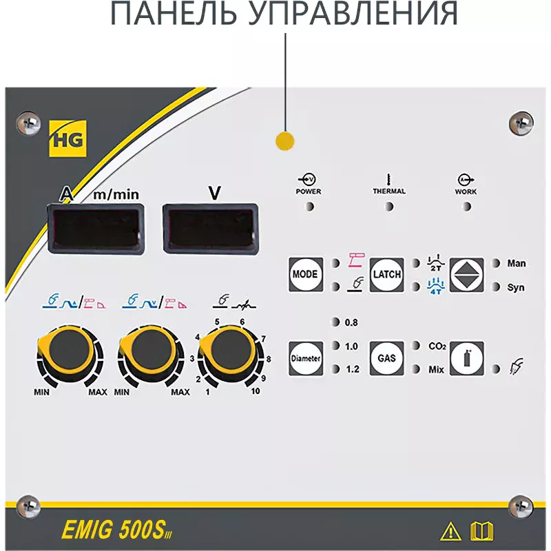 Синергетический режим обеспечивает максимальную простоту в работе и позволяет быстро подготовить сварочный аппарат Hugong EMIG 500S III к использованию. Достаточно задать желаемую скорость подачи проволоки, и значение напряжения будет выставлено системой автоматически.