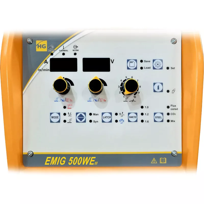 Благодаря синергетическому управлению вы быстро настроите сварочный аппарат Hugong EMIG 500WE III перед использованием. Достаточно установить желаемую скорость движения проволоки. Напряжение регулируется системой автоматически.