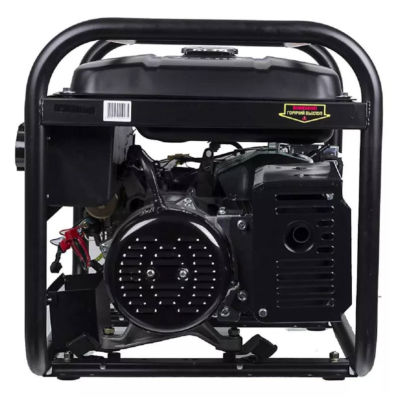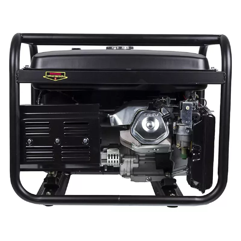 Для защиты от механических повреждений во время транспортировки есть защитная рама. Она представляет собой трубу, которая огибает весь корпус. Верхняя часть электрогенератора Patriot PT 3555ES Country образует ручки для переноски аппарата по рабочей площадке, а нижняя служит в качестве устойчивой опоры.