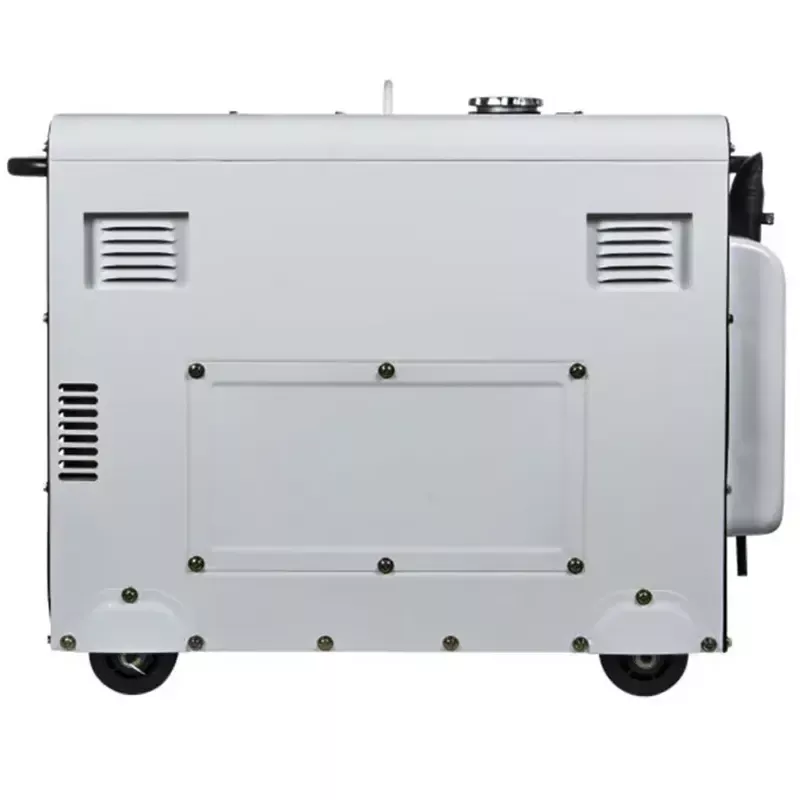 Эта модель электростанции предназначена для стационарного применения, но при этом, на ней установлены небольшие колеса и удобные рукоятки, которые облегчают ее перемещение. Двигатель с системой улучшенного запуска быстро заводится даже при низких температурах. Вам достаточно несколько раз нажать кнопку на панели управления, которая запускает подогрев воздуха при формировании топливной смеси.
