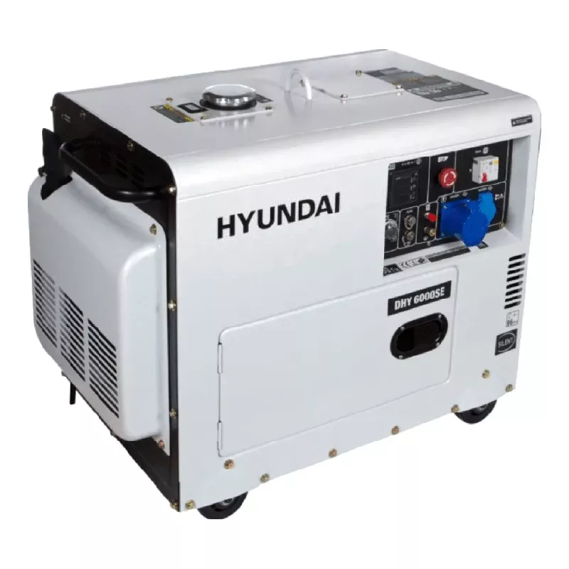 Дизельный генератор Hyundai DHY 6000SE с максимальной мощностью двигателя 5,5 кВт оснащен двумя розетками на 16 А и 32 А для питания однофазных приборов. Автоматическая система EASY START облегчает запуск мотора, для включения электростанции достаточно повернуть замок зажигания.