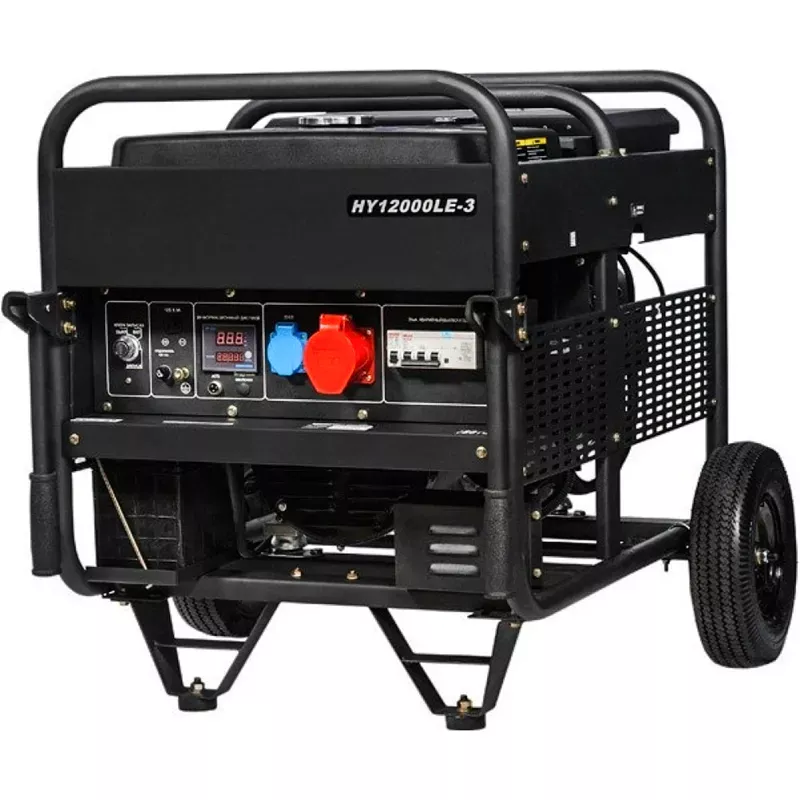 Бензиновый электрогенератор Hyundai HY 12000LE-3 оборудован прочной стальной рамой и металлическими экранами, которые защищают все важные элементы от механических повреждений. Для удобного перемещения устройства предусмотрены большие транспортировочные колеса и складные рукоятки.