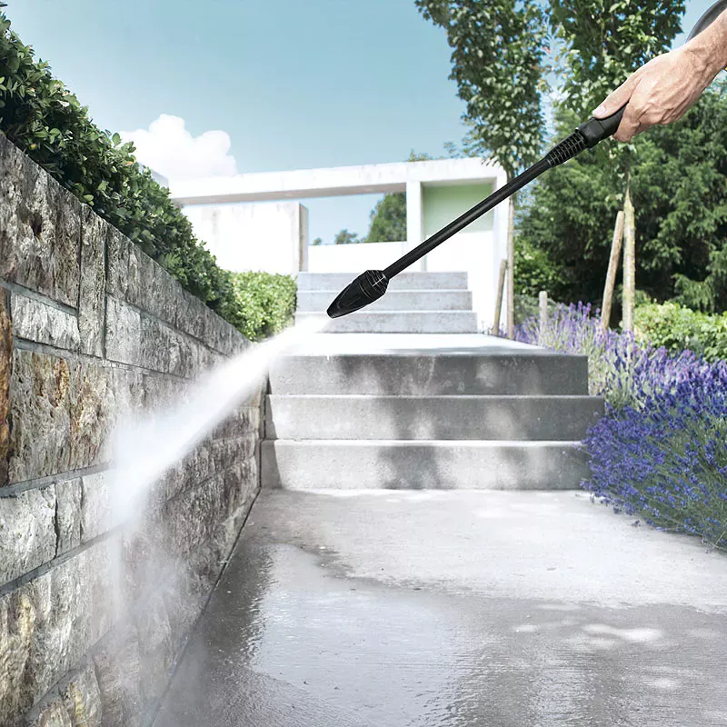 Удобная парковочная позиция обеспечивает быстрый доступ ко всем аксессуарам, струйная трубка и пистолет хранятся на корпусе, занимая минимум места, а телескопическая ручка, изготовленная из высококачественного алюминия, выдвигается на удобную высоту и полностью убирается при необходимости.