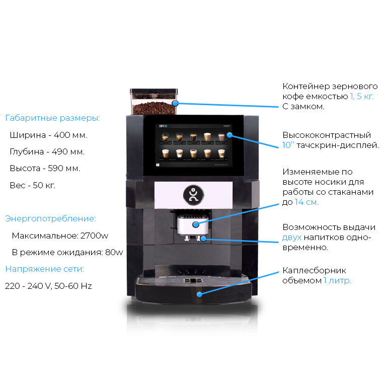 - Прозрачный контейнер кофе в видимой для покупателя зоне с отдельным замком