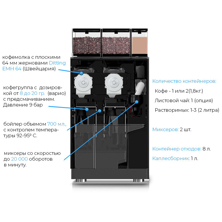 - Большой объем контейнеров зернового кофе и растворимых ингредиентов;