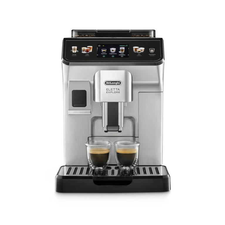 Кофемашина Delonghi Eletta Explore ECAM450.55.S – инновационная автоматическая кофемашина DeLonghi, которая способна приготовить более 40 изысканных горячих и холодных кофейных напитков. Такая кофеварка принесет в Ваш дом или офис богатый опыт кофеварки из лучших кофеен Европы, так как она предлагает большое меню сохраненных рецептов. Благодаря технологии LatteCrema Hot идеальный результат горячего напитка в каждой чашке. LatteCrema Cool – это освежающие холодные напитки. Воспользовавшись функцией To-Go – получите качественный кофе на вынос.