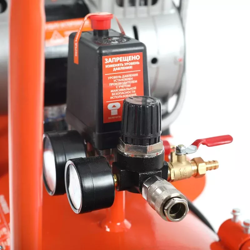 Давление настраивается вручную до максимального значения. Это позволит подключать различные пневмоинструменты. Во время регулировки вы можете отслеживать показатель с помощью манометра, расположенного на корпусе аппарата.