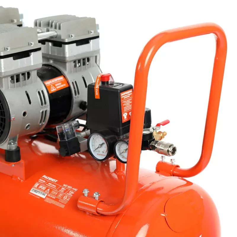 Компрессор Patriot WO 100-440 работает в 2 раза тише, чем аналогичные по мощности модели на масле. За счет этого вам не понадобится повышать голос при разговоре, если вы находитесь в помещении с работающим агрегатом. Помимо этого, за счет безмасляного типа модель можно перевозить и хранить в любом положении.