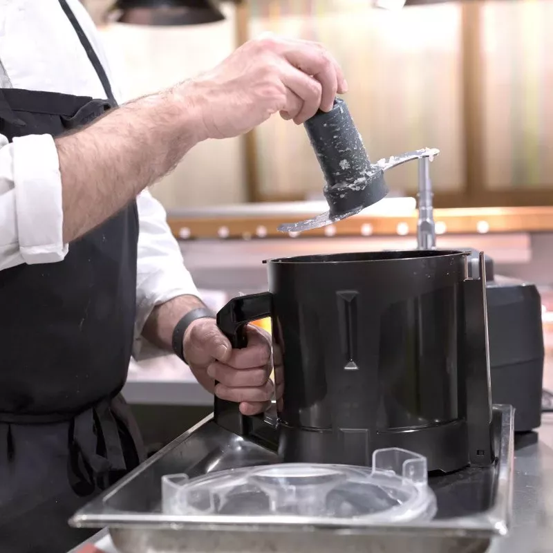 чаша объемом 4,4 л оснащена боковой мешалкой и высоким валом для увеличения производительности.