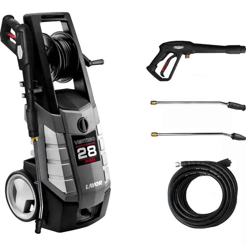 Электрическая минимойка LAVOR (Лавор) Vertigo 28 Pro – это топовая модель в линейке бытовых моек компании LAVOR. Модель оборудована низкооборотистым индукционным двигателем и надежным насосом высокого давления с головкой из латуни. В оснащение данного аппарата высокого давления входят большие колеса с покрышками из не оставляющей следов резины, профессиональный шлангом высокого давления 10 метров, барабан для хранения шланга, пистолет с защитой от несанкционированного нажатия, копье из нержавеющей стали с регулировкой давления и копье с грязевой фрезой.