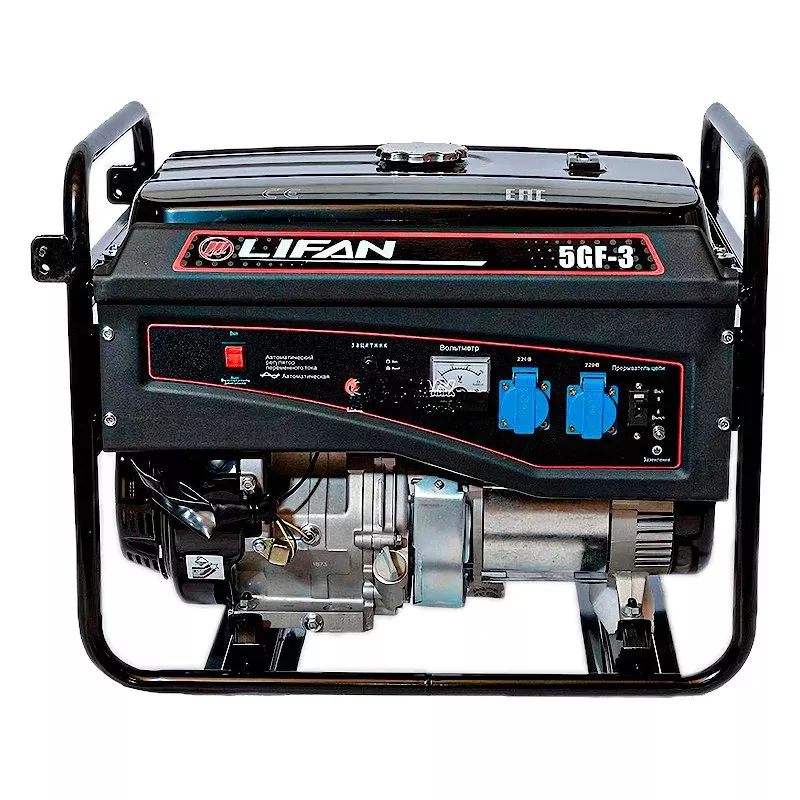Генераторы LIFAN компонуются двигателями собственного производства, изготавливаемыми по лицензии HONDA, которые заслуженно являются самыми продаваемыми двигателями на рынке. Бензиновый генератор LIFAN 5GF-3 - это превосходный источник резервного и основного питания для дачи, частного дома, зон проведения различных работ и множества других ситуаций, в которых необходима электроэнергия. Генератор обладает мощностью в 5/5,5 кВт и способен работать непрерывно на протяжении 9 часов, благодаря чему данная модель является оптимальным решением, без проблем обеспечивающим питанием большое количество энергоемких электроприборов в течение длительного времени. Специальные демпфирующие подушки, предусмотренные конструкцией LIFAN 5GF-3, позволяют устройству создавать меньше шума и вибрации. Удобная металлическая рама с рукоятками облегчает перенос и транспортировку генератора и обеспечивает его устойчивое положение на поверхности. На розетках имеются специальные крышки, защищающие от попадания твердых загрязнений и влаги. Как и все однофазные генераторы LIFAN, данная модель является "действительно однофазной" (одна "фаза" 220 Вольт и один "ноль") и имеет медную обмотку, позволяющую повысить КПД, уменьшить расход топлива, нагрев и износ агрегата, тем самым увеличивая срок его службы. Оснащена вольтметром, индикатором уровня топлива, системой контроля уровня масла и автоматического отключения в случае снижения его уровня, а также системой защиты от перегрузок.
