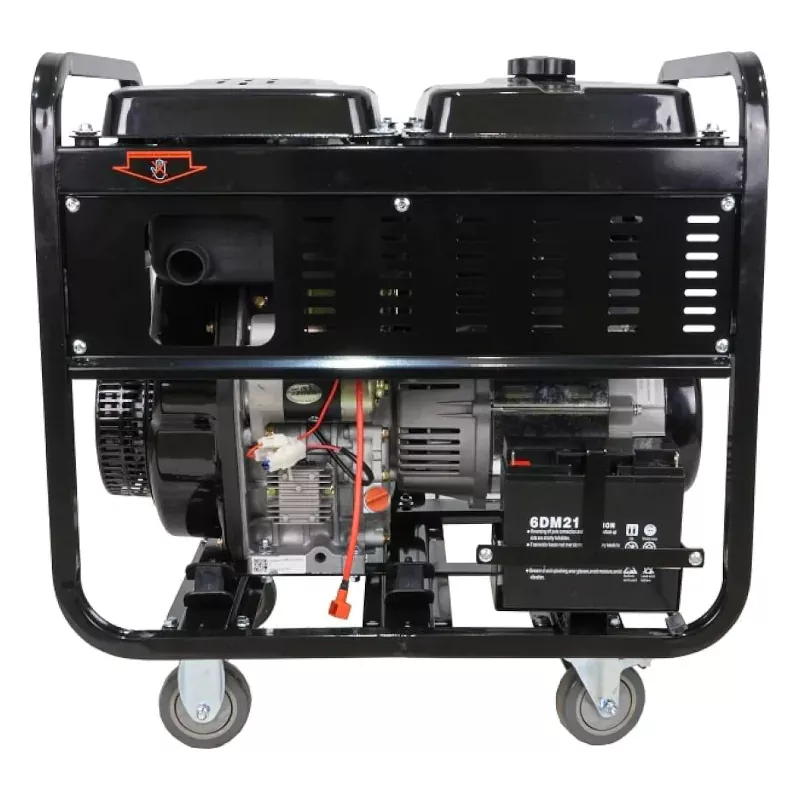 Генератор открытого типа обеспечивает простой доступ ко всем основным узлам для технического обслуживания и ремонтных работ. Для защиты и жесткости конструкции предусмотрена прочная металлическая рама. Внизу она образует платформу, к которой крепятся колеса, а вверху — боковые ручки.