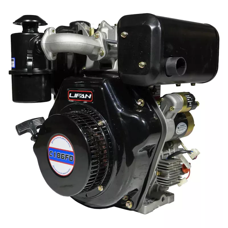 Двигатель Lifan 186 FD обладает массой в 46 килограмм, это достаточно легковесный и компактный агрегат, он способен обеспечить высокую продуктивность работы при минимальных затратах и потерях. Его простая конструкция не создаст проблем при установке или при обслуживании, использование эффективного воздушного охлаждения позволяет активно использовать мотор даже в жаркую погоду, удобный пусковой тросик и система декомпрессии, обеспечивают легкий запуск двигателя.