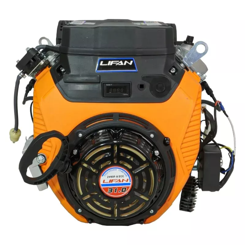 Двигатель LF2V80F ECC 31 л.с. D25 20А LIFAN - двухцилиндровый бензиновый двигатель, который используется на генераторах, минитракторах, мотобуксировщиках, вездеходах, снегоходах и другой силовой технике. Данная модель имеет горизонтальный вал, воздушное охлаждение, ручной и электрический старт, автоматическую воздушную заслонку и электронный регулятор газа. Двигатель дополнительно оснащен катушкой 20 Ампер, которая позволяет подключать полезное электрооборудование соответствующей мощности. Вращение вала против часовой стрелки. Поставляется без топливного бака!