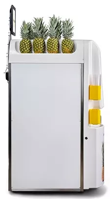 • Простое трехшаговое использование: клиент помещает банку с ананасами в предусмотренное место, вставляет ананас в машину, забирает банку с нарезанным ананасом и закрывает ее предусмотренной крышкой.