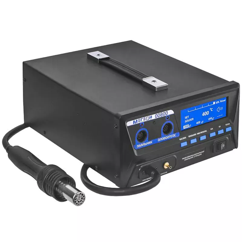 Многофункциональная паяльная станция МЕГЕОН 00800 представляет собой качественный и современный радиомонтажный инструмент. Данная станция оснащена термофеном, что позволяет использовать её для монтажа и пайки различных электронных компонентов. Наиболее часто, данная паяльная станция используется для работы с термоусадками, удаления стикеров и краски, предварительного нагрева поверхностей и предметов. Благодаря использованию современных компонентов и схем питания, паяльная станция отличается высокой стабильностью и надежностью.