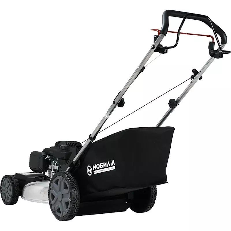 Самоходный тип перемещения газонокосилки Мобил К XM561 Про значительно облегчает стрижку травы. Вам не понадобится толкать технику по участку. Это облегчает маневрирование и разворот модели. Скорость движения составляет 3,4 км/ч. Вам понадобится только задавать направление при помощи рукоятки. Колеса оснащены подшипниками для плавного хода. Для лучшей проходимости задние колеса больше передних.