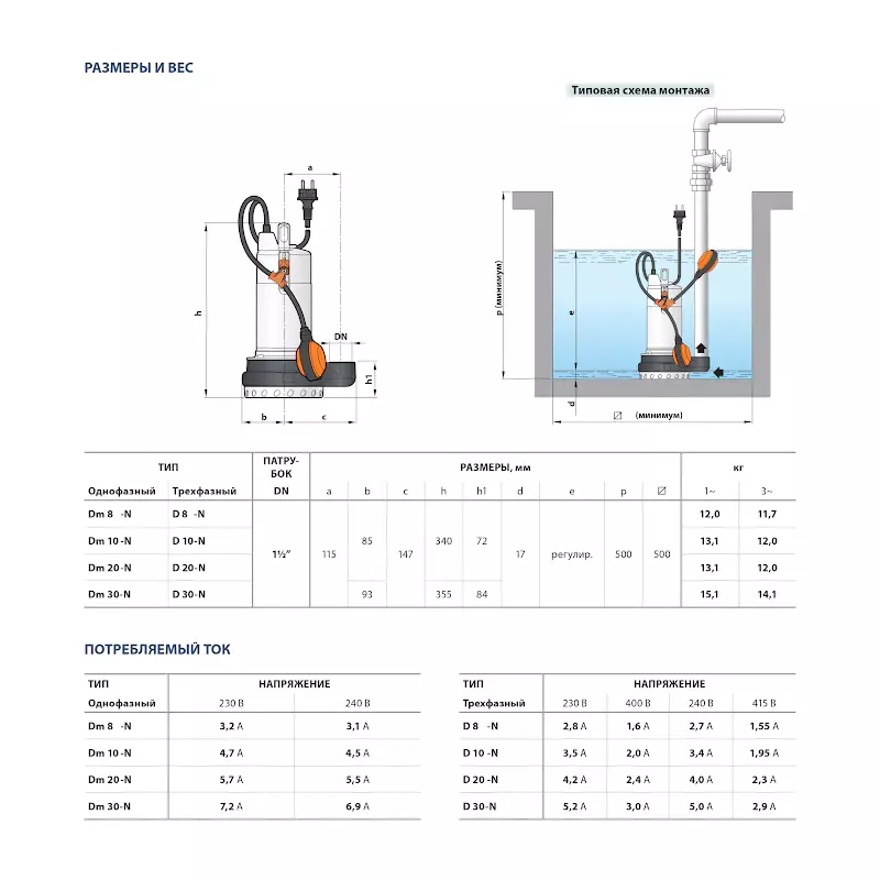 - Минимальный уровень погружения при непрерывном режиме работы 220 мм