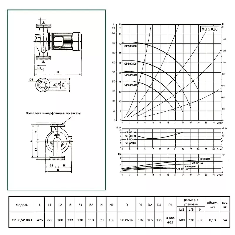 Корпус насоса, опора двигателя, рабочее колесо и крышка вентилятора — чугун, присоединение — фланцы PN 16 оснащены резьбовыми отверстиями для манометров или контрольных датчиков. Торцевое уплотнение – скользящего типа, графит/керамика.