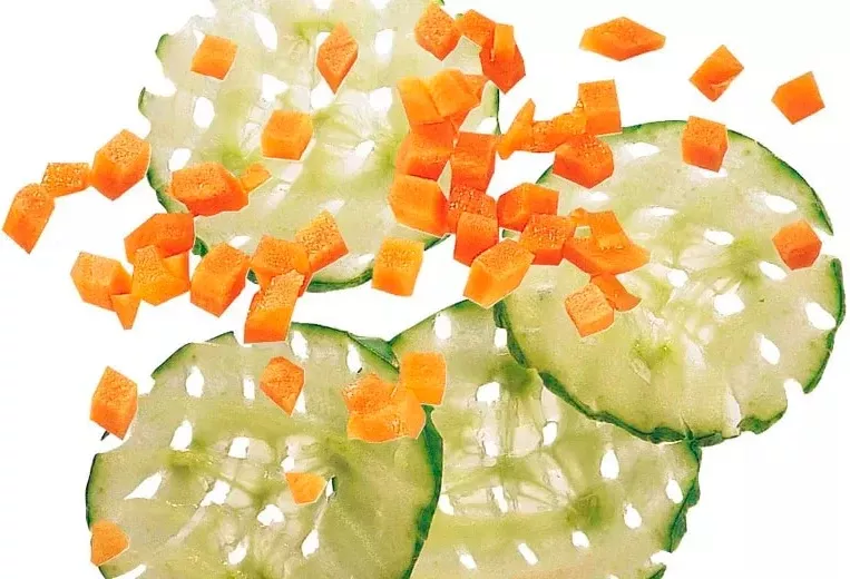 50 дисков (опционально), позволяющих производить все виды нарезки: стружку, волнистую нарезку, соломку, жюльен, брусочки и кубики (от 5х5х5 мм до 25х25х25 мм) с точностью и высоким качеством