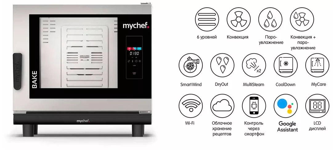 • Облачное хранение рецептов и параметров приготовления на базе сайта Mychef с возможностью подключения нескольких печей.