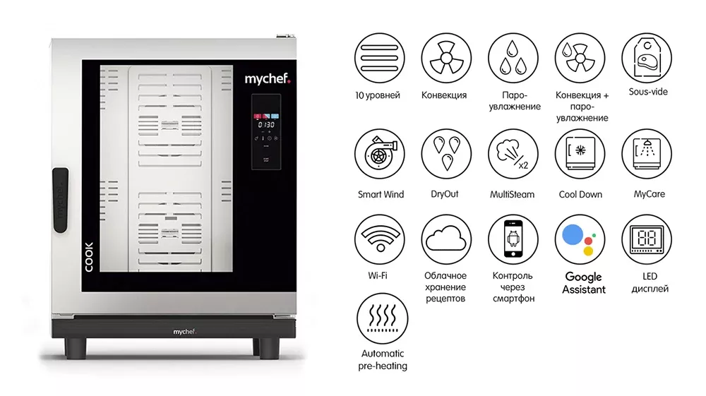 Речевое управление пароконвектоматом с помощью приложений Google Assistant и Google Home, с возможностью контролировать вкл/выкл пароконвектоматов, оставшееся время приготовления, устанавливать температуру, влажность, таймер, скорость вентилятора, голосовое включение запрограммированных рецептов.