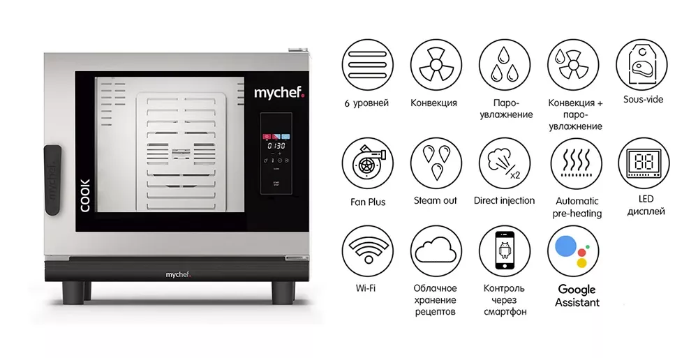 Речевое управление пароконвектоматом с помощью приложений Google Assistant и Google Home, с возможностью контролировать вкл/выкл пароконвектоматов, оставшееся время приготовления, устанавливать температуру, влажность, таймер, скорость вентилятора, голосовое включение запрограммированных рецептов.