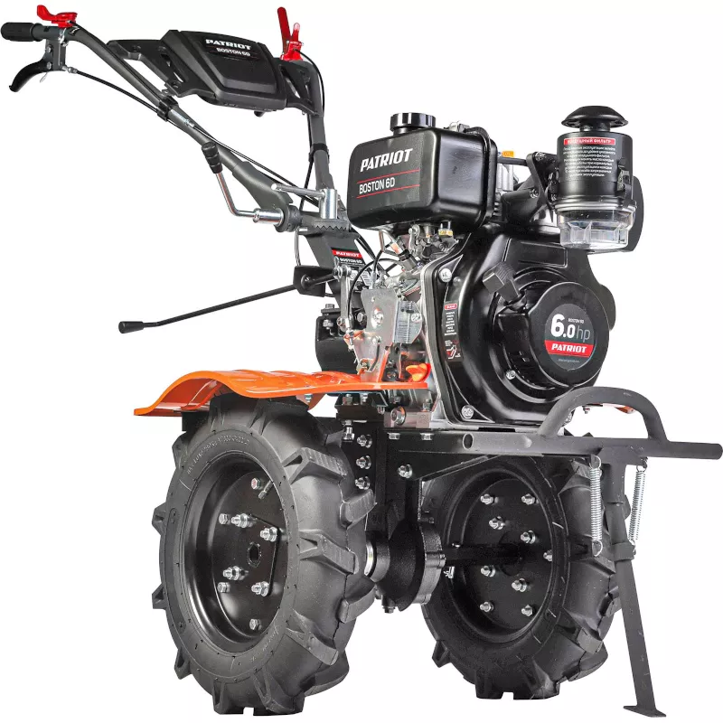 Дизельный мотоблок Patriot Boston-6D обеспечивает ширину обработки в 105 см и поставляется в комплекте с фрезами, которые способны вспахать даже целину. Для облегченной работы предусмотрено несколько скоростей движения, большие колеса тракторного типа и возможность установки навесного оборудования: от картофелевыкапывателя и плуга до грузовой тележки.