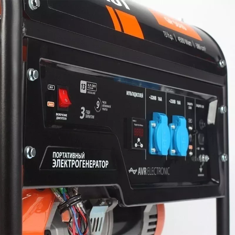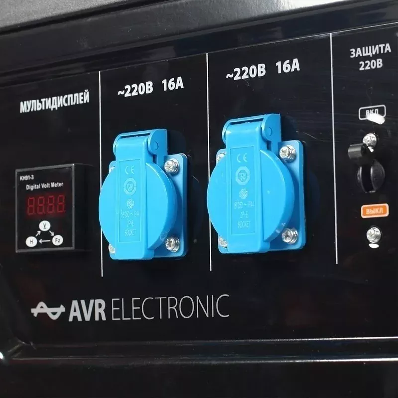 Цифровой электронный мультидисплей позволяет контролировать все выходные характеристики: напряжение, частоту, а счетчик моточасов помогает следить за интервалами между техническим обслуживанием. Выход 12 вольт позволяет подзарядить автомобильный аккумулятор в экстренном случае. Усиленная передняя панель с утопленными элементами управления снижает риск механически.