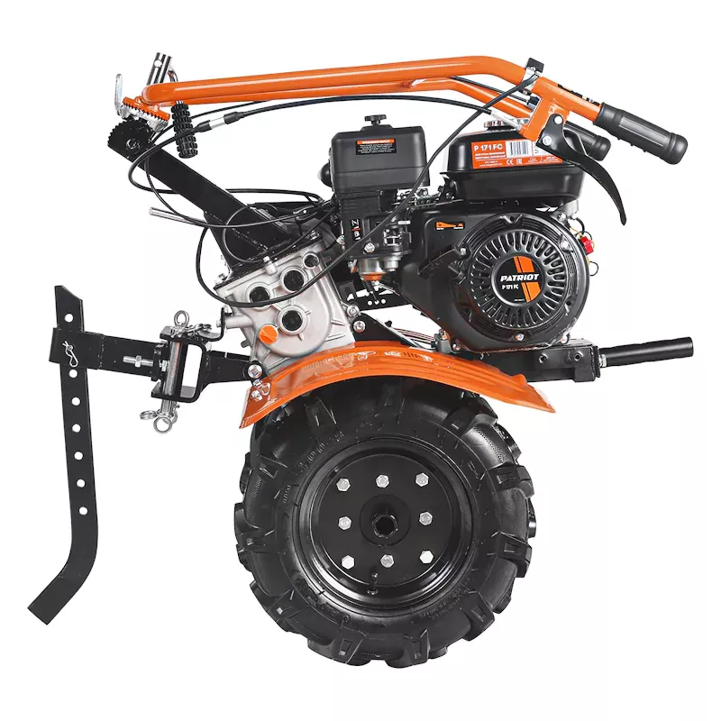 Мотоблок PATRIOT КАЛУГА оснащен колесными покрышками с высокими рельефными протекторами, которые отличаются хорошим сцеплением с грунтом и маневренностью. Металлические крылья защищают от вращающихся частей мотоблока и летящих во время работы комьев земли. Продолжительная работа без дозаправки гарантирована благодаря вместительному топливному баку. Используемый в качестве трансмиссии шестеренчатый редуктор в алюминиевом корпусе с масляной ванной обеспечивает долгий срок службы и высокую надежность мотоблока. Рукоятку можно сложить на время хранения.