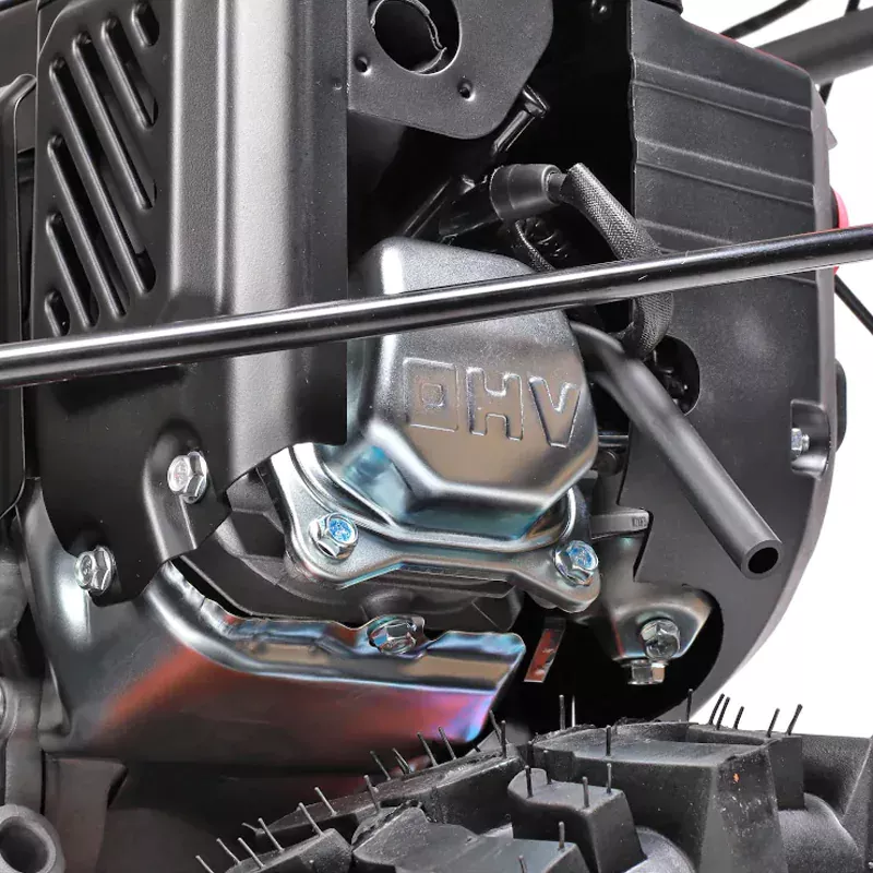 Все элементы управления расположены на операторской панели. Благодаря этому вы можете настраивать работу снегоуборочной машины одной рукой. Например, задавать скорость движения или регулировать дальность выброса снега. Снегоуборщик движется за счет трансмиссии, поэтому уборка территории не потребует от вас много сил. На ваш выбор есть 6 скоростей вперед и 2 назад.