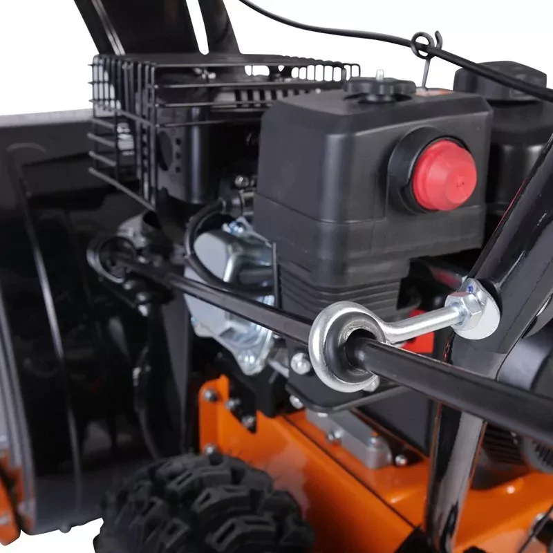 На выходе желоба выброса предусмотрена защитная металлическая решетка, которая не пропускает куски льда или камней, попавшие в ковш. Гладкие рычаги включения привода колес и работы шнека обеспечивают удобный захват, а мягкие прорезиненные рукоятки снижают воздействие вибрации. На панели управления расположены переключатель скоростей и регулятор, изменяющий направление выброса снега.