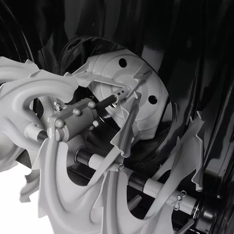 Шнековый механизм состоит 4 секций, каждая из которых крепится на вал редуктора с помощью срезных болтов. Они защищают двигатель от перегрузок, если во время работы в заборный ковш попадёт посторонний предмет, например камень или толстая ветка, штифты автоматически оторвутся и не допустят поломки узла. Благодаря специальной форме зубьев ножи быстро перемалывают большие сугробы и создают воздушный поток, который помогает проталкивать переработанную массу в раструб.