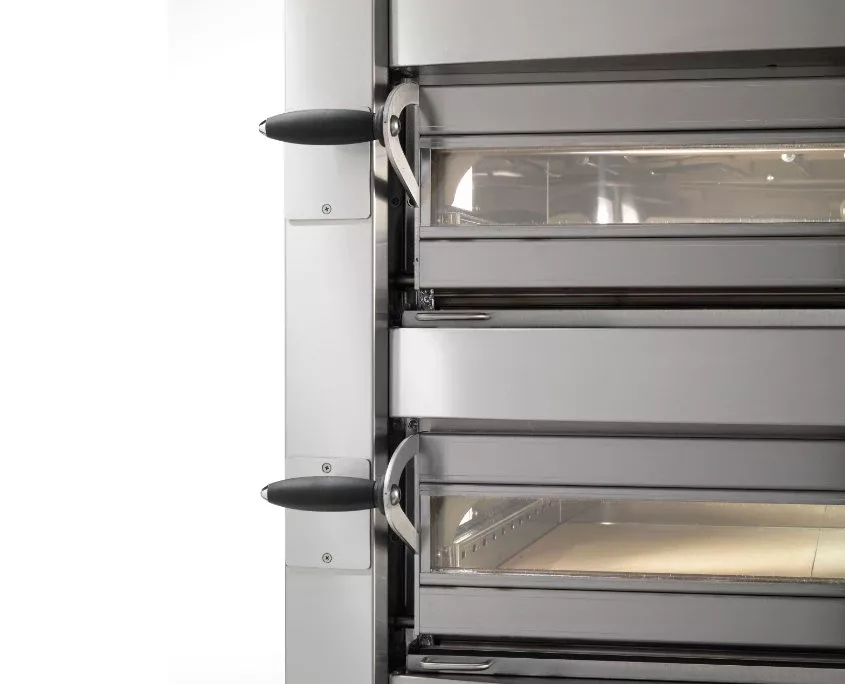 Печь для пиццы Cuppone ML935/2CD с передней панелью округлой формы из нержавеющей стали предназначена для приготовления пиццы и различных закусок, таких как, сэндвичи, куриные стрипсы и т.д. на предприятиях общественного питания.