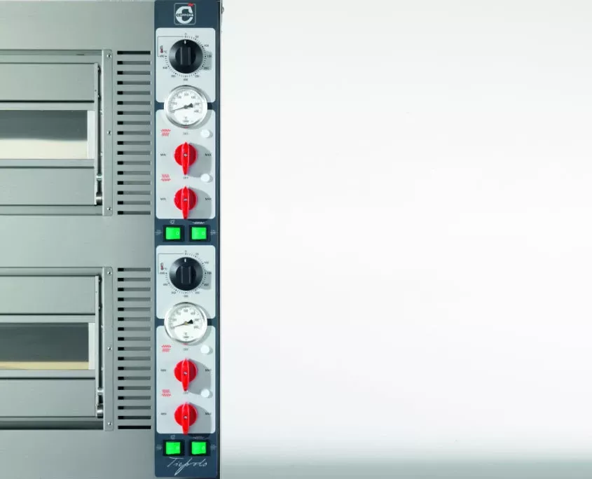 Печь для пиццы Cuppone TP935/2CM с передней панелью и камерой выпечки из нержавеющей стали предназначена для приготовления пиццы и различных закусок, таких как, сэндвичи, куриные стрипсы и т.д. на предприятиях общественного питания.