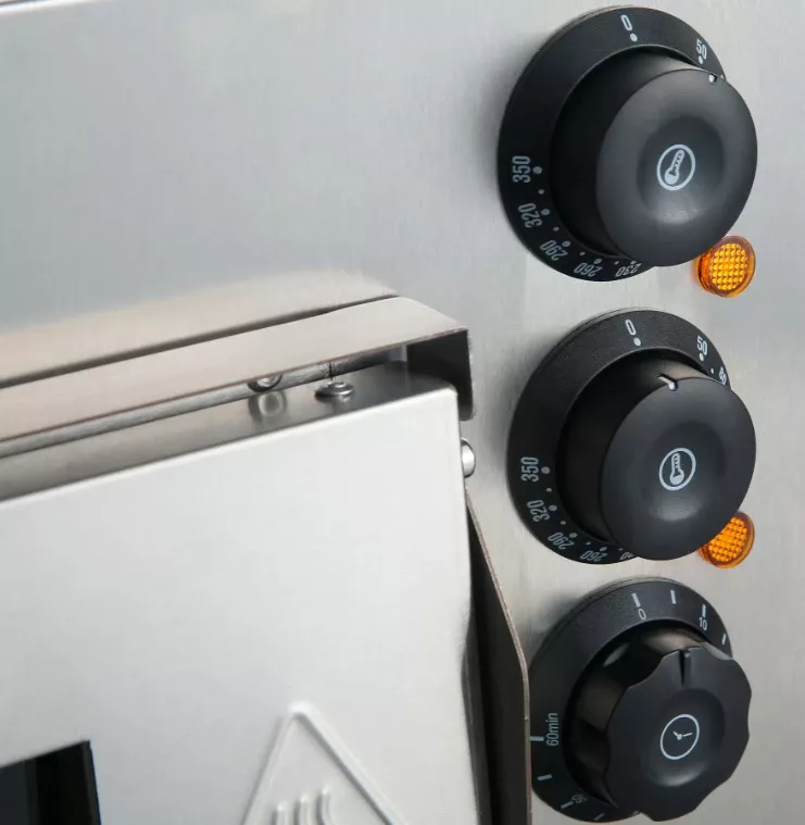 Печь оснащена удобной механической панелью управления и стеклянным смотровым окном для слежения за процессом приготовления.