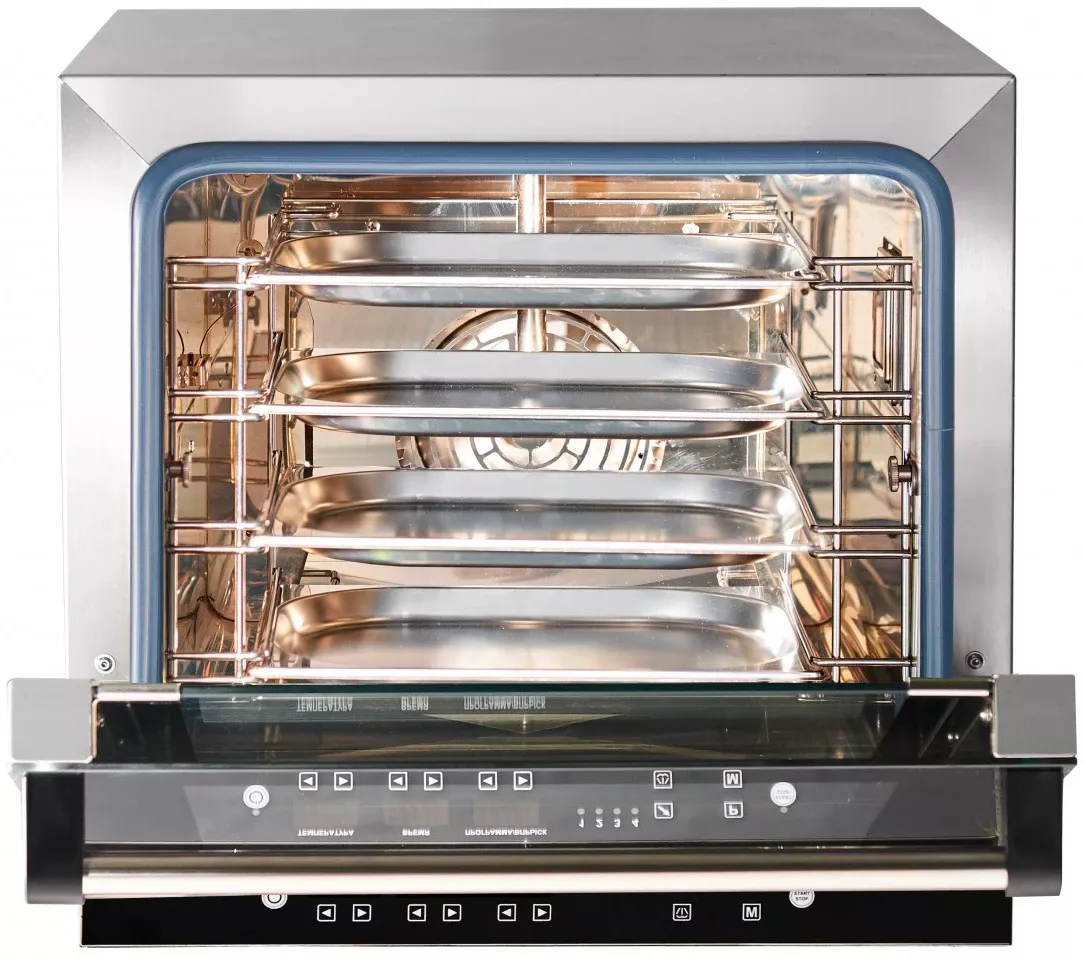 Термообработка продуктов осуществляется за счет равномерной циркуляции горячего воздуха внутри рабочей камеры.