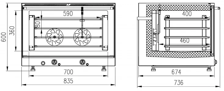 Возможность установки 4 противня размером 600х400, что обеспечивает увеличение количества выпекаемой продукции до 25 кг/ч
