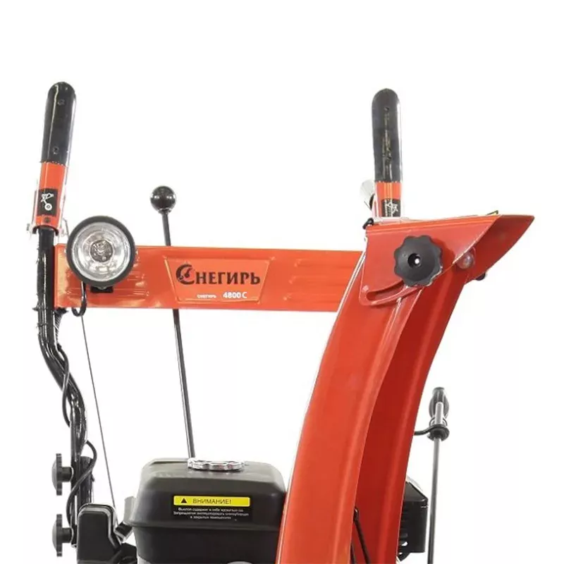 Снегоуборщик бензиновый Снегирь 4800 С оснащен двигателем мощностью 7 л.с. и высотой захвата 54 см. За счет этого можно убирать просторные территории даже с высокими сугробами. Присутствует электростартер и галогенная фара для облегчения работы.