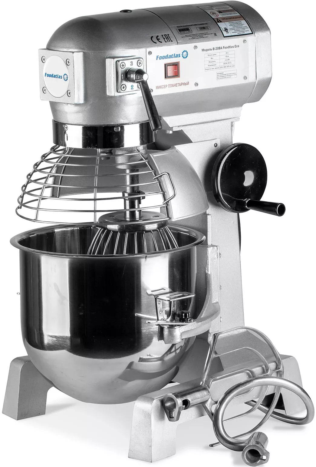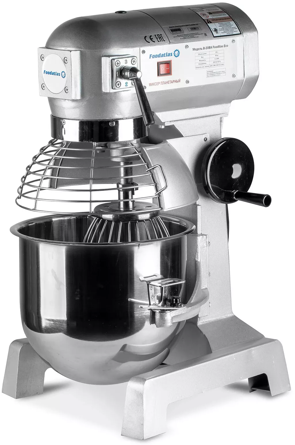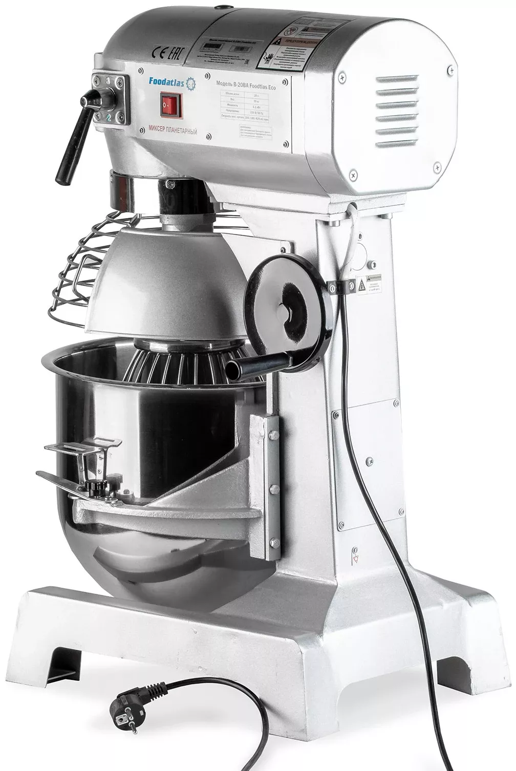 Планетарный миксер FoodAtlas Eco B-20FA используется на предприятиях общественного питания и торговли замеса жидкого теста, кремов, начинок и прочих жидкостей.