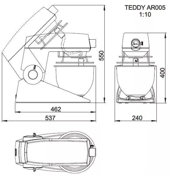 • специально разработанный для миксера Teddy двигатель работает противоположным образом, он очень мощен при низких скоростях, когда мощность нужна для смешивания вязкого теста, однако, несмотря на высокую мощность, двигатель Teddy работает очень тихо, что является положительным фактором для оператора и рабочих условий