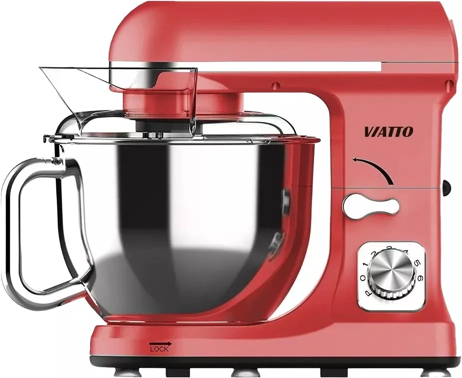 _Планетарный миксер Viatto VA-SM5R предназначен для взбивания и замешивания различных кондитерских масс: суфле, муссов, кремов (белкового, заварного, масляного), пюре, соусов, теста (бисквитного, дрожжевого, блинного и заварного). Имеет 6 скоростей вращения насадки, что позволяет выбирать оптимальный режим работы для приготовления различных продуктов. Оснащён съёмной дежой с ручкой и подъёмной траверсой. Корпус выполнен из ABS-пластика красного цвета, все элементы, соприкасающиеся с продуктами, – из нержавеющей стали, защитная крышка – из поликарбоната. Рекомендуется к применению в небольших кафе и ресторанах, частных кондитерских, мини-пекарнях и на других предприятиях общественного питания малого формата.В комплект поставки входят 3 насадки (крюк, плоский битер, цельнометаллический венчик).