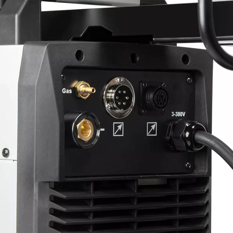 Аппарат оснащен металлическим 4-х роликовым механизмом подачи проволоки. В механизме установлены ролики с габаритами 30х10х12 для стальной проволоки диаметром 0,8-1,0 мм. Есть кнопка протяжки проволоки и кнопка проверки газа перед стартом работ.