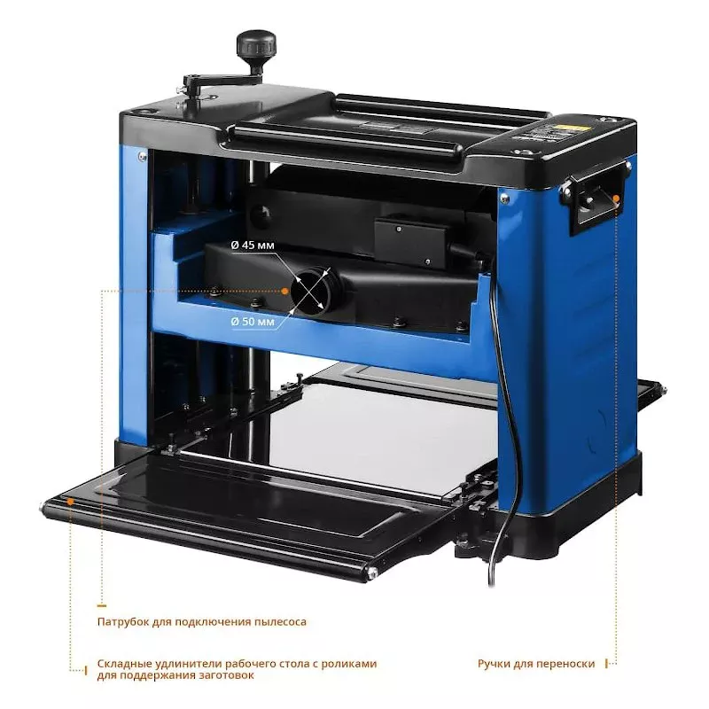 Удлинители стола позволяют обрабатывать крупные изделия из древесины. Раскладываются по обеим сторонам рейсмусового станка. На краях удлинителей есть ролики, которые упрощают перемещение заготовки.